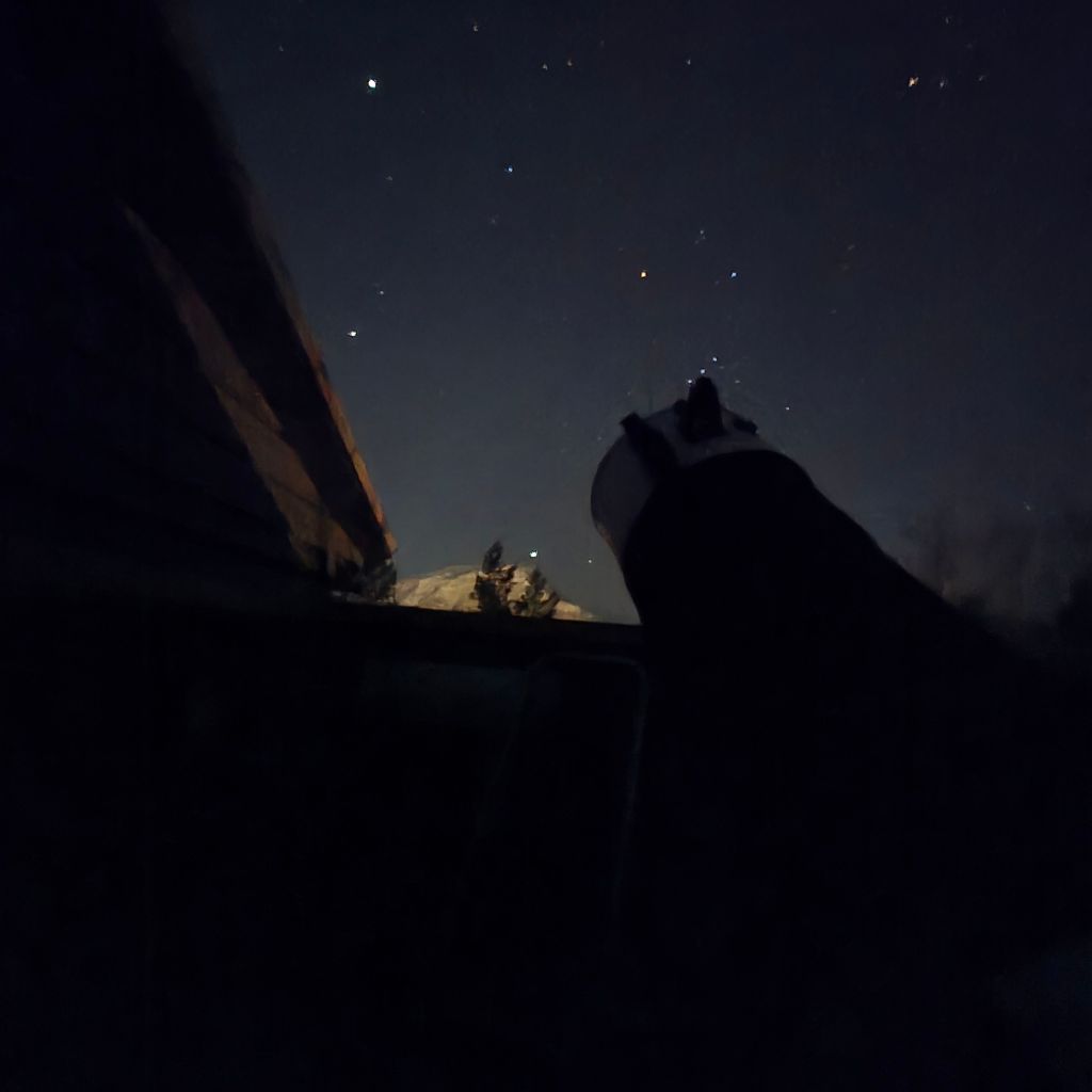 Stjernebildet Orion fotografert frå Kometland med mobiltelefon. Legg merke til stjerna Sirius som kliver Rosethornet. Sirius eller Hundestjerna som ho kallast, er vinterhimmelens klaraste stjerne, og ei av dei nærmaste stjernene med ein avstand på 8.4 lysår. Bildet som er tatt i februar 2025 viser litt av Volda sentrum i forgrunnen.