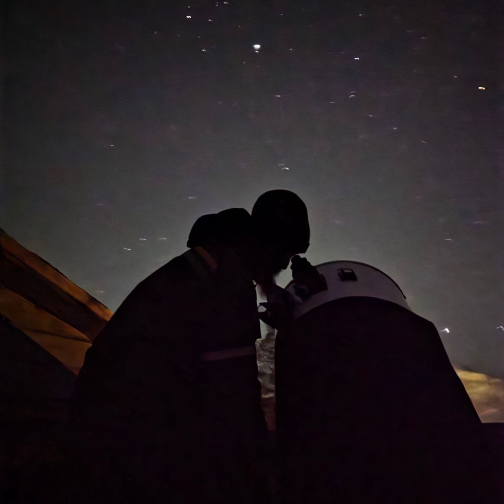 Ein av dei besøkande i ferd med å observere den vakre stjerneklynga Pleiadane i stjernebildet Tyren. Pleiadane kjent på folkemunne som Sjustjernene, er ei av dei nærmaste opne stjernehopane. Avstanden er omlag 420 lysår.