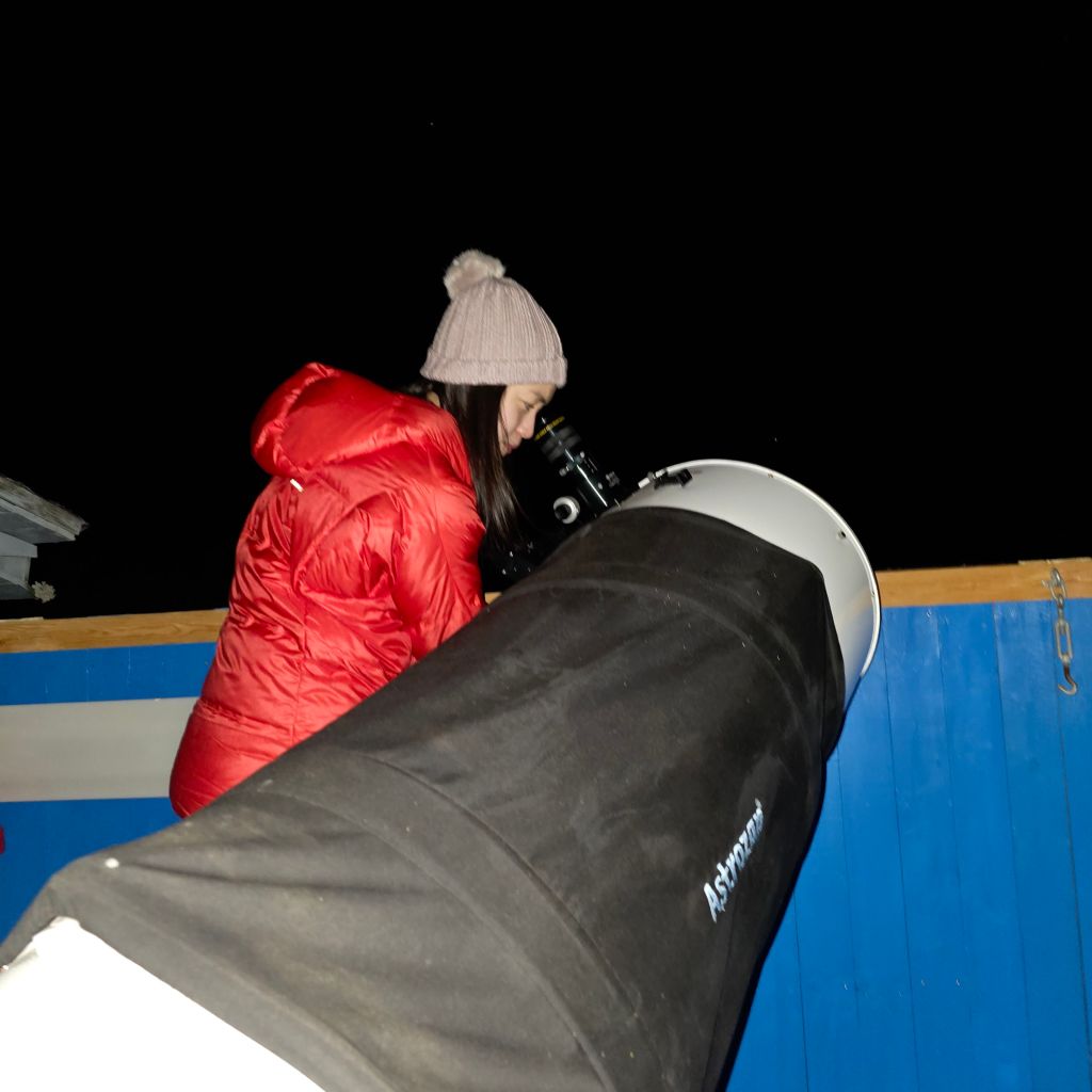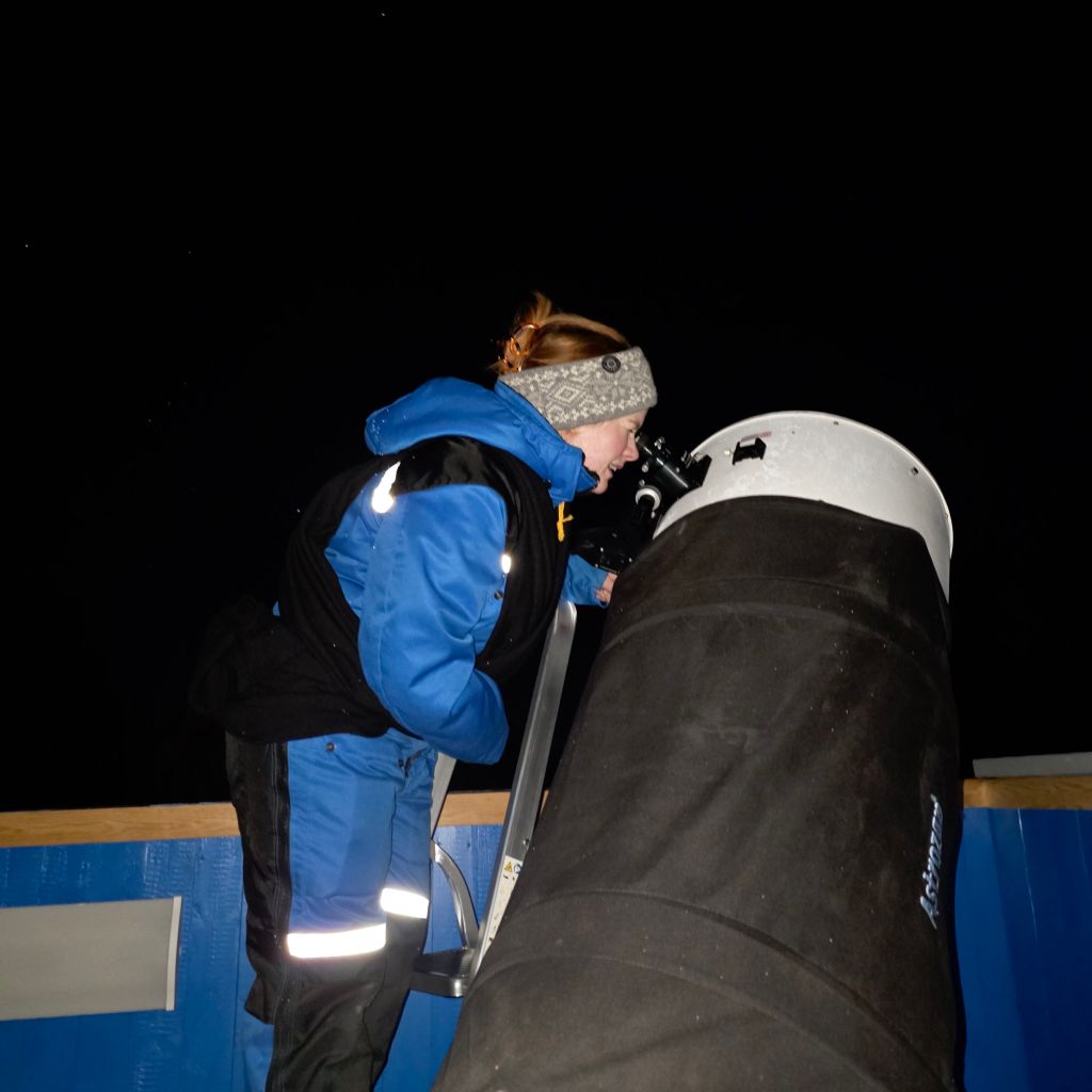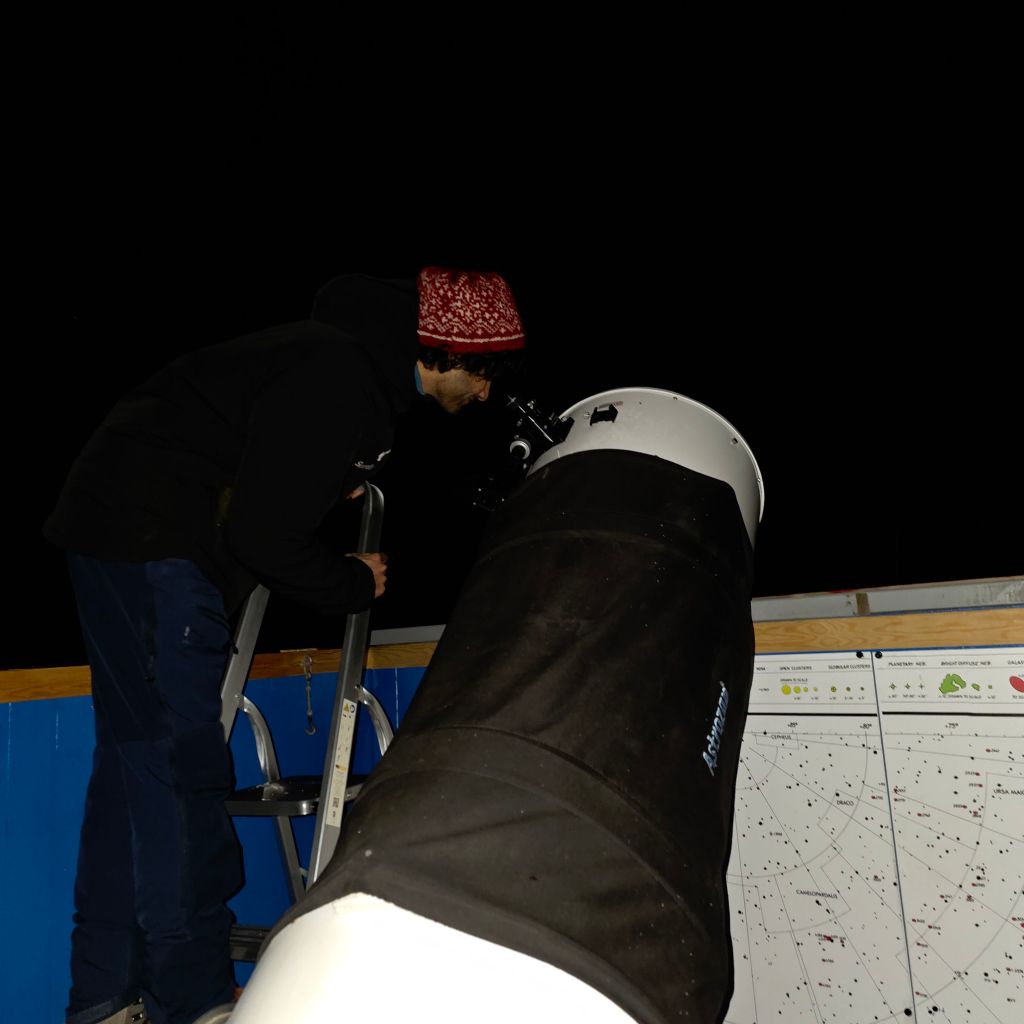 Ein observatør (besøkande) observerer stjernehimmelen gjennom eit 16″ f/4.5 Meade Ligh Bridge dobson teleskop.