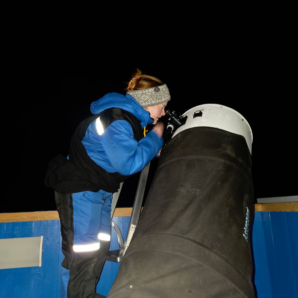 Dette bildet vart tatt den 5. april på Kometland, då ei gruppe frå Ørsta og Stranda var på besøk. Bildet viser nokre av dei ved eit 70mm teleskop som vi brukte til å observere Månen med.